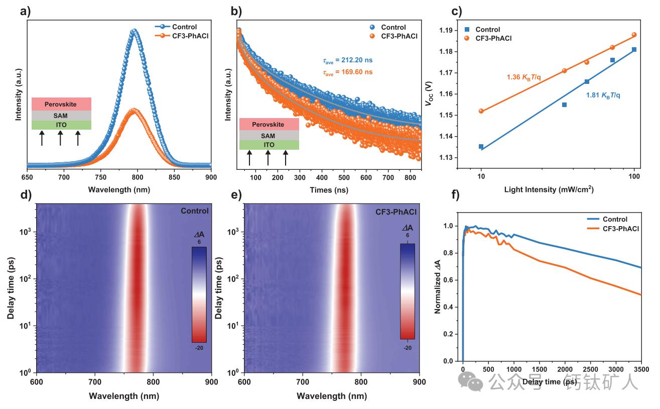 图4. 对照和CF3-PhACl改性的钙钛矿太阳能电池和膜的光学和电子表征。a)沉积在ITO/SAM衬底上的对照和CF3-PhACl改性的钙钛矿膜的PL光谱和B)TRPL曲线。c)对照和CF3-PhACl改性的器件的光强度依赖性VOC曲线。d)对照和e)CF3-PhACl改性的器件的埋底界面的TA谱。f)相应GSB峰的归一化电荷载流子动力学。