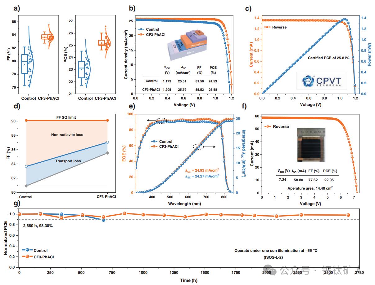 图5. 对照和CF3-PhACl改性的钙钛矿太阳能电池的光伏性能和稳定性测试。a)从对照和CF 3-PhAC 1改性的钙钛矿太阳能电池的J-V特性曲线导出的光伏参数的统计。B)在反向扫描下具有0.09 cm 2的活性面积的CF 3-PhAC 1改性的钙钛矿太阳能电池的J-V曲线。插图:CF 3-PhACl改性的钙钛矿太阳能电池的示意图SAM:c)在掩模面积为5.34mm2的反向扫描下的经认证的J-V曲线。d)对照和CF 3-PhACl改性的钙钛矿太阳能电池的FF损失分析。对照和CF 3-PhACl改性的钙钛矿太阳能电池的EQE光谱和积分JSC。f)在反向扫描下,具有14.40cm 2的孔径面积的CF 3-PhACl改性的钙钛矿太阳能微型模块的J-V曲线。g)在55-65 ℃和20- 30%RH的温度下,在连续MPP和用白色发光二极管(LED)照射一个太阳下,封装的器件的ISOS-L-2稳定性方案。