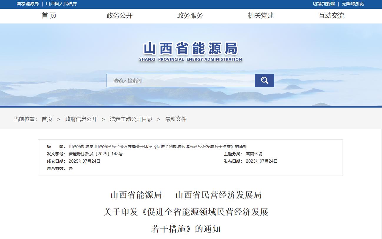 7月24日,山西省能源局、山西省民营经济发展局发布关于印发《促进全省能源领域民营经济发展若干措施》的通知。