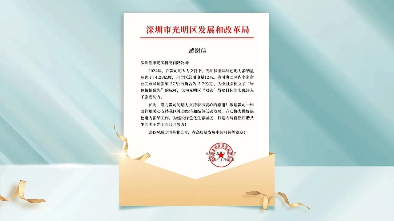 创维光伏积极响应光明区绿色发展号召,深度参与光明区绿色电力消纳工作。在其全力推动下,光明区全年绿色电力消纳量达到14.29亿度,占全区总用电量的12%。同时,协助区内多家企业完成绿证消纳27万张,折合电量2.7亿度。