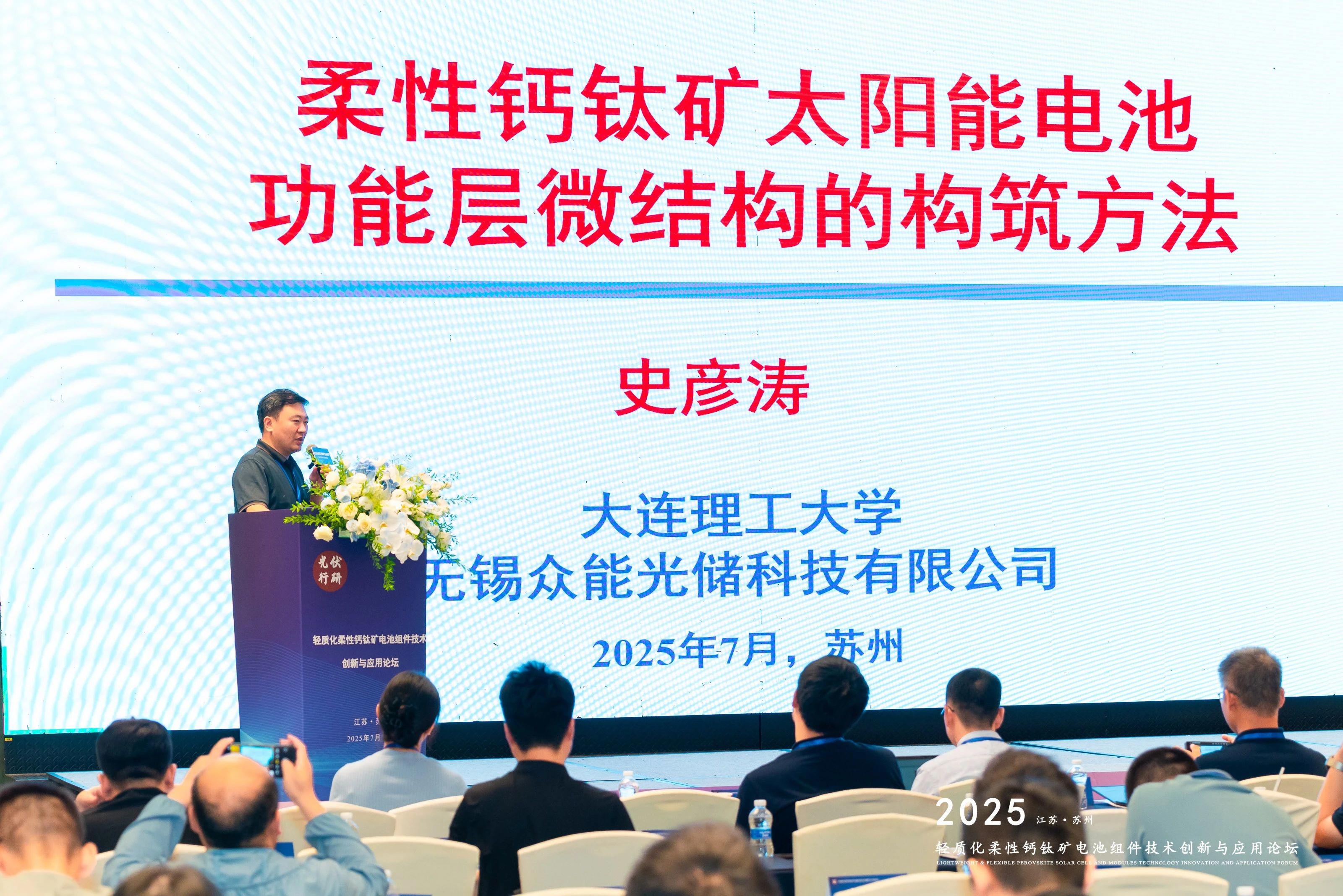 2025年7月25日,轻质化柔性钙钛矿电池组件技术创新与应用论坛在江苏苏州举办,本次论坛旨在促进轻质化柔性钙钛矿技术在全球能源转型中的规模化发展,推动柔性钙钛矿产业链上下游协同创新及场景应用,助力轻质柔性钙钛矿技术实现从实验室向千兆瓦级绿色能源生产跨越。众能光储董事长史彦涛教授为与会嘉宾带来了《柔性钙钛矿太阳能电池功能层微结构的构筑方法》主题演讲。