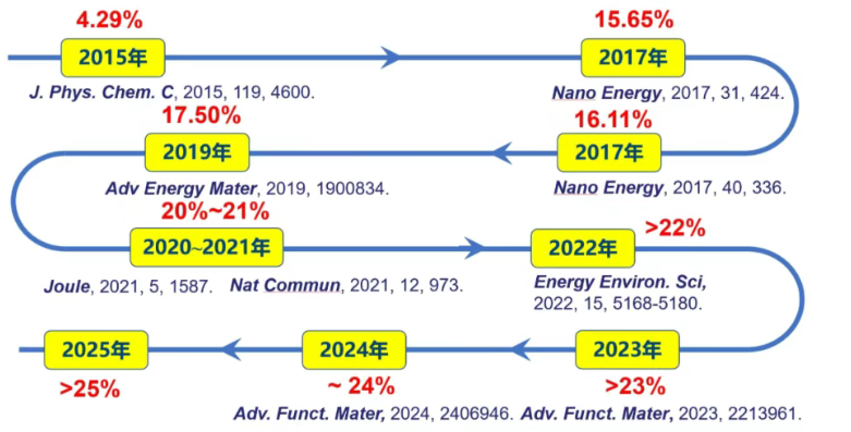 历经十余年研究探索,众能光储团队持续刷新柔性钙钛矿电池效率世界纪录,柔性钙钛矿转换效率自2015年的15.65%提升至2024年的24%,预计今年将进一步突破25%。
