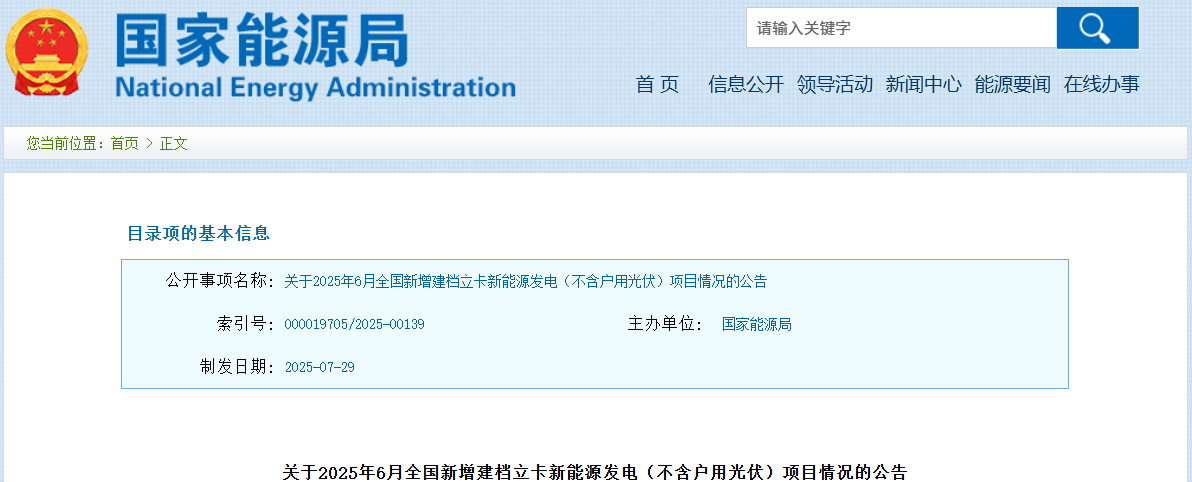 关于2025年6月全国新增建档立卡新能源发电(不含户用光伏)项目情况的公告