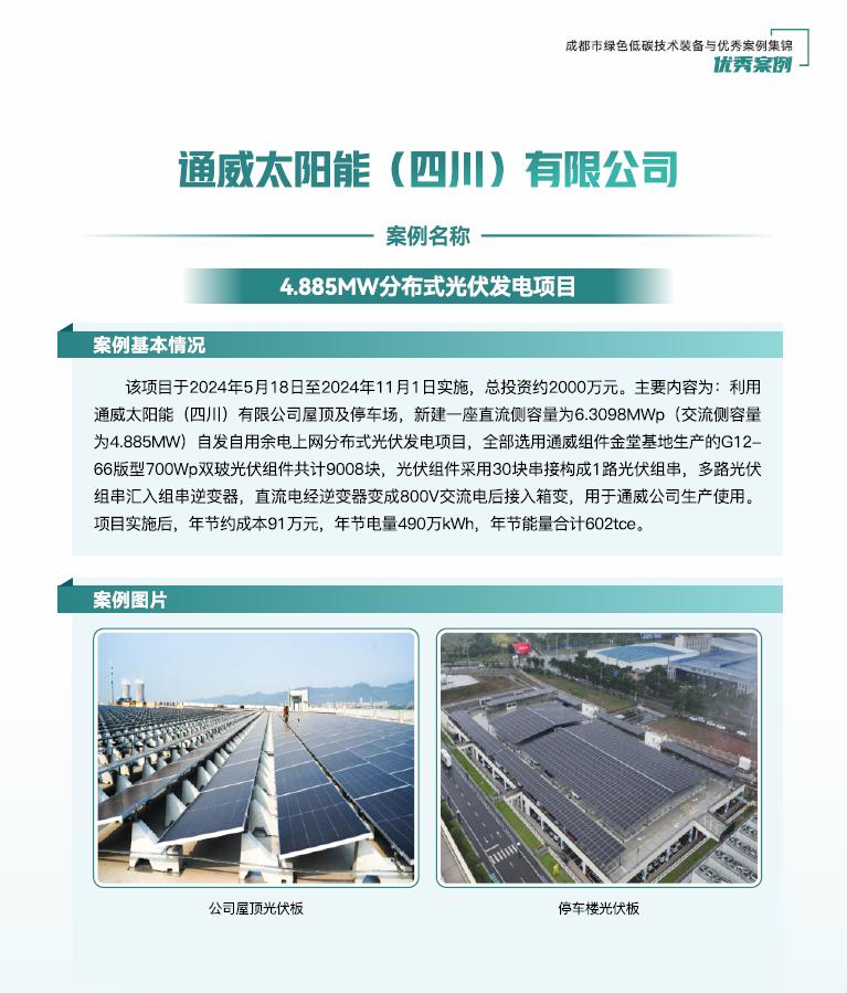 近日,成都市经济和信息化局公布了2025年《绿色低碳技术装备与优秀案例集锦》,通威太阳能科技金堂基地6.3098MWp分布式光伏项目成功入选,成为推动成都绿色低碳发展的标杆案例之一。