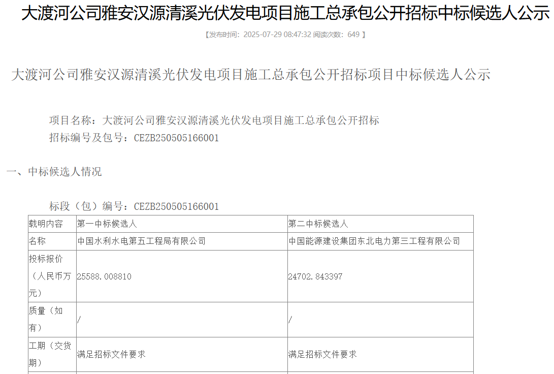 7月29日,国能大渡河瀑布沟发电有限公司风光基地建设管理分公司公示了雅安汉源清溪光伏发电项目施工总承包中标候选人。