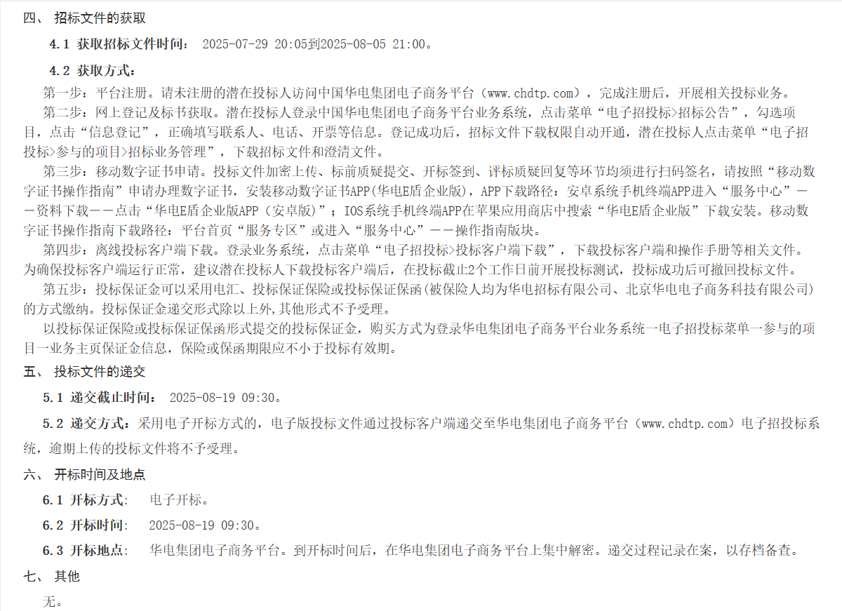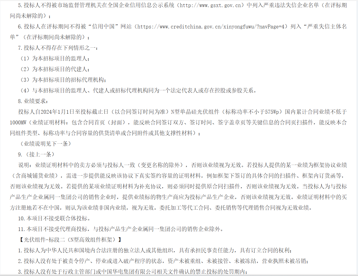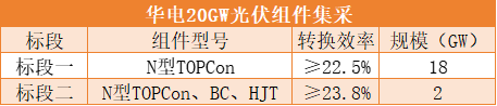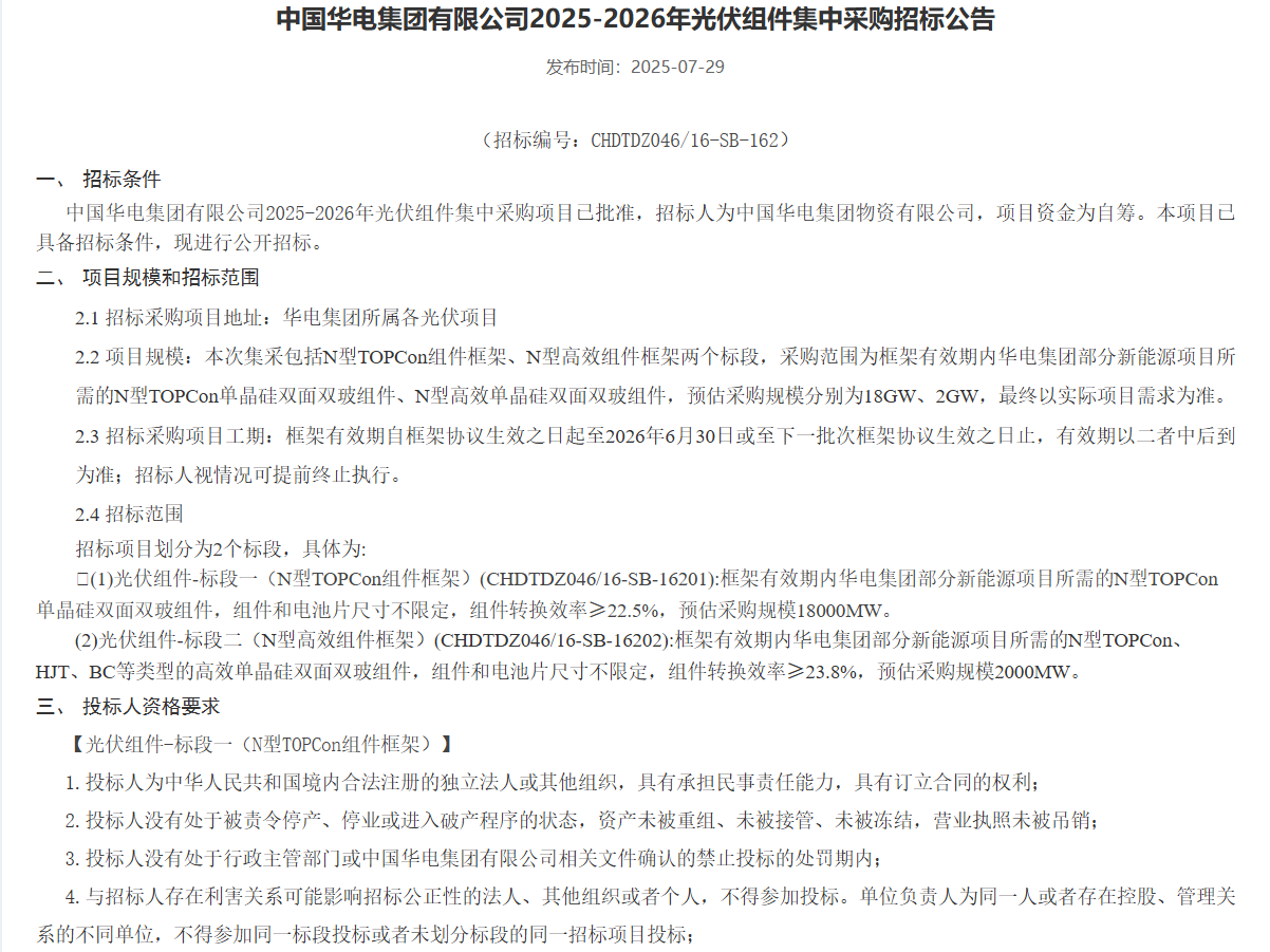 7月29日,华电集团发布2025—2026年光伏组件集中采购招标公告,采购规模为20GW。此次招标共划分2个标段,N型TOPCon、N型高效。标段二规模为2GW,不限组件类型,转换效率要求≥为23.8%。