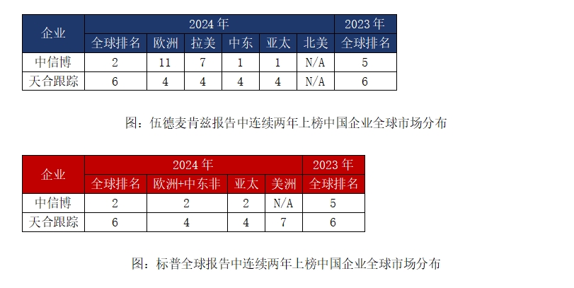 2024年全球跟踪企业出货量排名(左:伍德麦肯兹报告;右:标普全球报告)