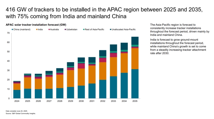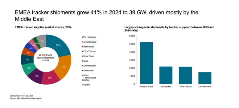 在标普全球报告中,EMEA地区出货量绝对增量最高,从27GW增至41GW,其中中东地区贡献了7.6GW的增量。与2023年相比,该地区出货量涨幅前三的跟踪支架供应商中,中国企业天合跟踪排名第三。