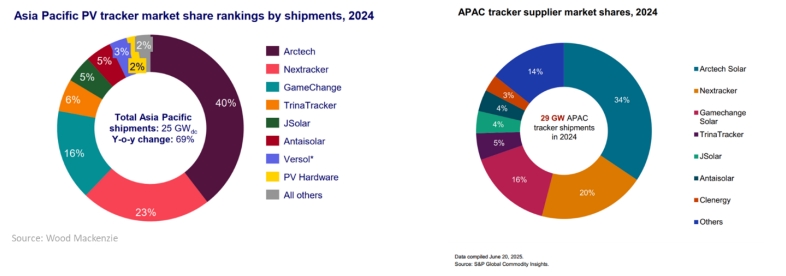两家机构对亚太地区的光伏跟踪支架出货排名分析基本一致。伍德麦肯兹报告中显示,亚太市场总出货量25GW,其中印度以15.8GW独占鳌头,市场前三强(中信博、GameChange、Nextracker)合计占据96%市场份额。报告指出,中信博在印度市场出货7.6GW,占当地份额48%,并凭此位居亚太地区出货量首位,也为其取得“全球第二”打下基础。目前暂未见其他两家中企在印度市场有明显布局,天合跟踪则依托亚太其他市场贡献,取得区域第四的良好成绩。