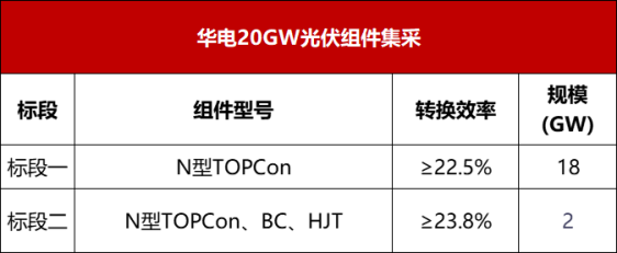7月29日,华电集团发布2025—2026年光伏组件集中采购招标公告,采购规模为20GW,共划分2个标段,N型TOPCon、N型高效。根据招标公告,标段一规模为18GW,组件要求为N型TOPCon,转换效率为≥22.5%;标段二规模为2GW,不限组件类型,转换效率要求≥为23.8%。