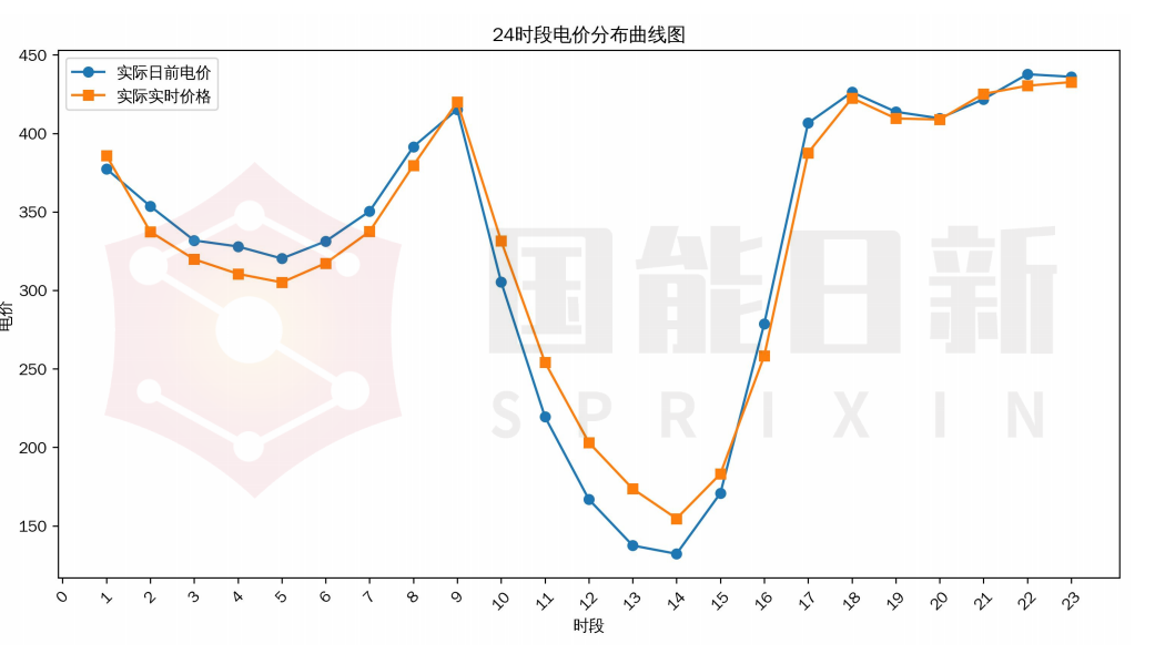 分时来看,湖北市场的现货峰谷价差相对较小,早晚峰高价明显,实时现货均价在300-450元/兆瓦时之间,午间时段价格则相对较低,实时现货均价在50-250元/兆瓦时之间。在凌晨时段(如0-5时左右),实际实时价格都处于相对较低的水平。