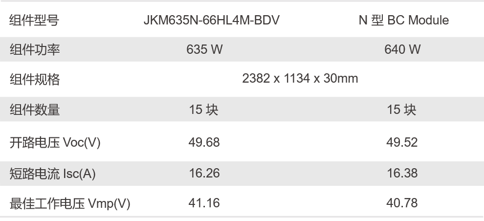 为确保数据可比性,实证选用15块晶科N型TOPCon双面635W组件与15块N型BC双面640W组件进行对比。两串组件以5°倾角朝南并行安装,并接入同型号组串式逆变器,有效规避系统平衡部件差异对数据的干扰。