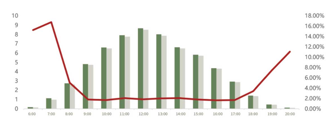 TOPCon组件展现的“早启、晚停”特性,显著延长了系统的有效发电时间窗。与N型BC组件相比,TOPCon在弱光条件下的发电量优势区间为2.0%至7.18%,其能量捕获能力和系统效率提升显著。