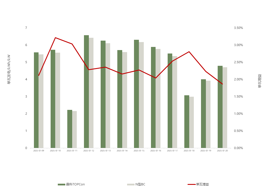 图表2:不同日期N型TOPCon与N型BC组件单瓦发电增益对比