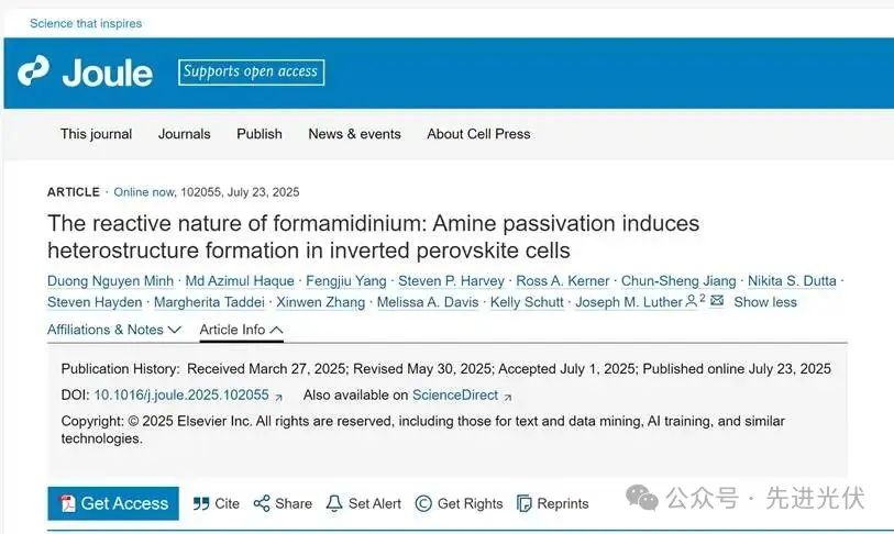 Duong Nguyen Minh, Md Azimul Haque, Fengjiu Yang, Steven P. Harvey, Ross A. Kerner, Chun-Sheng Jiang, Nikita S. Dutta, Steven Hayden, Margherita Taddei, Xinwen Zhang, Melissa A. Davis, Kelly Schutt, Joseph M. Luther,The reactive nature of formamidinium: Amine passivation induces heterostructure formation in inverted perovskite cells, Joule 2025, 102055 ,