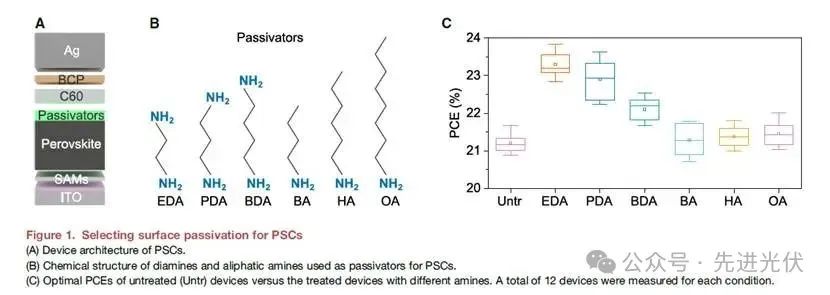 3.优化钝化策略提高器件效率:通过优化二胺分子的浓度和溶剂类型,研究成功将钙钛矿太阳能电池的功率转换效率(PCE)提升至超过25%。该钝化策略显著增强了表面缺陷的钝化效果,提升了器件的稳定性和效率,展现了钙钛矿太阳能电池高效能的潜力。