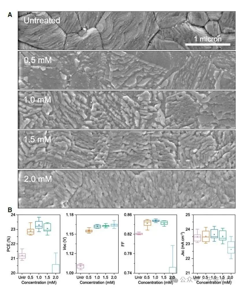 2.表面微观结构的高质量调控:研究中,使用扫描电子显微镜(SEM)观察到表面在钝化过程中经历了特定的刻蚀过程,形成了高质量的面向特定方向的晶体结构。这种表面定向生长的低维度异质结构,不仅提高了钙钛矿薄膜的表面质量,还有效优化了光电性能。
