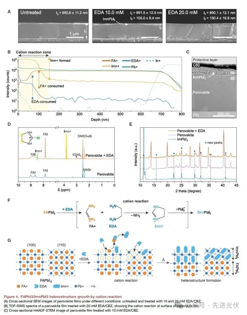 在倒置钙钛矿太阳能电池中,表面钝化处理一直是提高器件性能的关键研究方向。传统观点认为钝化分子通过简单地与表面结合来实现钝化。然而,本研究揭示了短链二胺分子在表面钝化过程中,选择性地与A位阳离子发生反应,形成环状分子,进而在表面上构建低维度的晶体异质结构,而非仅仅附着于表面。这一发现强化了钙钛矿中使用的A位阳离子——甲脒(FA+)的高反应性观点。研究中,常见的二胺分子(如乙烯二胺,EDA)能够从钙钛矿表面提取甲脒阳离子(FA+),并形成如咪唑铵(Imn+)等环状分子,明显将钙钛矿表面转变为与原始钙钛矿晶格对齐的ImnPbI3结构。研究通过扫描电子显微镜(SEM)图像展示了钙钛矿表面在合成和薄膜形成过程中的演变,呈现出高质量的表面刻蚀面,这些面最初沿特定平面刻蚀,随后成分从FAPbI3转变为ImnPbI3。这一发现对迄今为止所有基于胺分子的钝化策略具有重要的启示意义。研究还进一步探讨了其他钝化剂及溶剂极性对表面转变的影响。采用这一钝化策略优化后的器件,功率转换效率(PCE)超过25%,为高效钙钛矿太阳能电池的表面化学提供了新的见解。