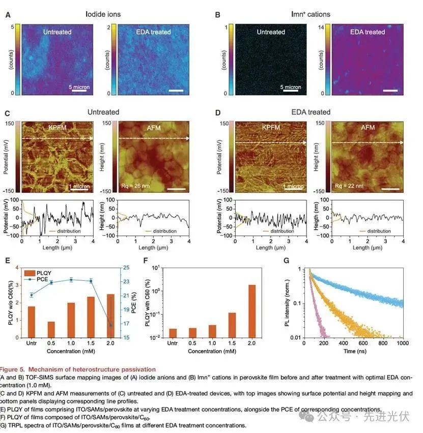 为评估异质结构钝化对器件效率的提升作用,研究人员使用TOF-SIMS对未经处理与1.0 mM EDA处理后的薄膜进行表面成分分析。结果显示,EDA钝化后薄膜中的I⁻分布更加均匀,总体信号强度下降约45%,表明钝化层有效抑制了碘空位和卤素迁移等表面缺陷。Kelvin探针力显微镜(KPFM)与原子力显微镜(AFM)测量也表明,EDA处理可显著收窄表面电势分布,减少界面复合,有利于载流子提取。表面粗糙度也从未处理的26 nm略降至22 nm,表明钝化不仅没有增加粗糙度,反而略微改善了表面平整性。在光学性能方面,光致发光量子效率(PLQY)在最佳EDA浓度下明显提高,无论是否覆盖C₆₀层,说明ImnPbI₃钝化层同时兼具缺陷钝化与载流子传输功能。时间分辨光致发光(TRPL)结果进一步确认载流子寿命从26 ns大幅提升至102 ns(1.0 mM)和520 ns(2.0 mM),充分证明该钝化策略显著降低了界面复合。