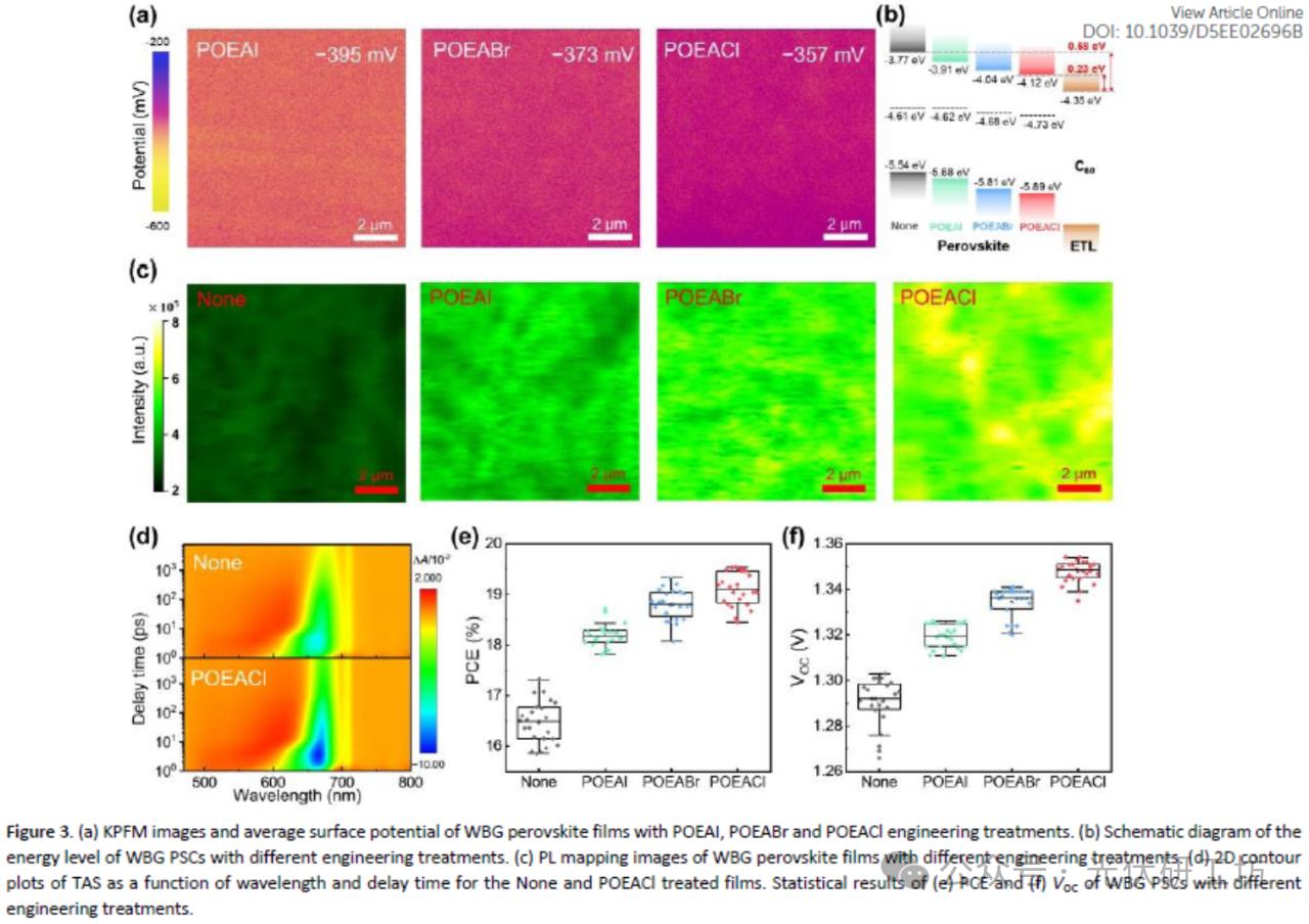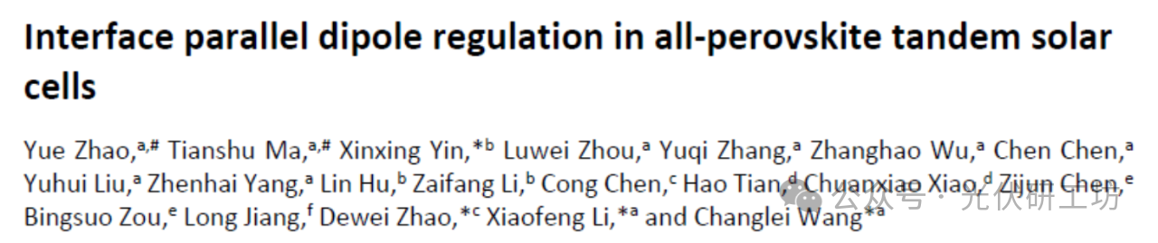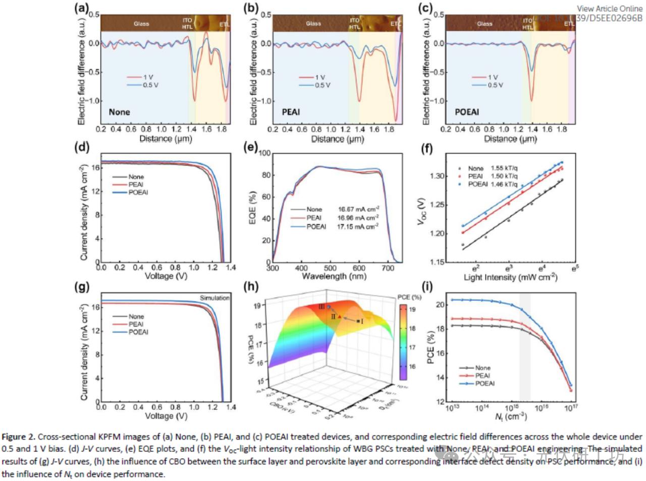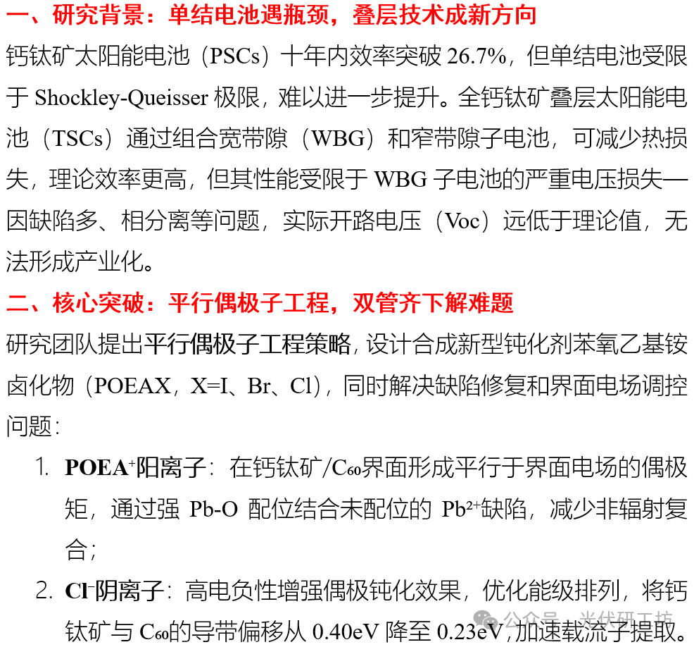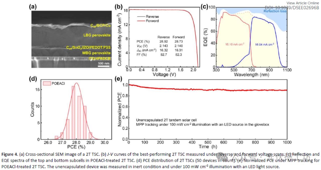 尽管单结钙钛矿太阳能电池的光电转换效率已突破27%,其商业化进程仍受限于长期运行稳定性的瓶颈。然而,即便在隔绝水与氧等外界应力的条件下,钙钛矿太阳能电池的寿命仍显著短于硅基器件。研究组设计并开发了一系列含乙二醇醚侧链的离子液体,以协同提升钙钛矿太阳能电池的效率与稳定性。该离子液体优先富集于钙钛矿底部,可显著抑制碘化铅的聚集及空隙的形成。