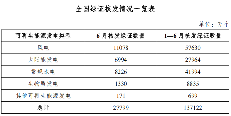 2025年6月,国家能源局核发绿证2.78亿个,环比增长29.33%,涉及可再生能源发电项目19.87万个,其中可交易绿证1.96亿个,占比70.64%。本期核发2025年5月可再生能源电量对应绿证2.02亿个,占比72.70%。2025年1—6月,国家能源局共计核发绿证13.71亿个,其中可交易绿证9.58亿个。