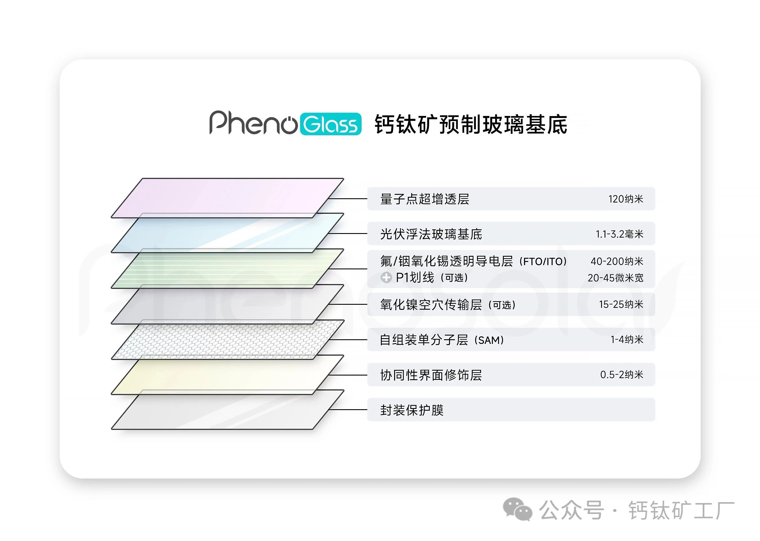 现象光伏正式推出业内首款集成自组装单分子层(Self-Assembled Monolayer, SAM)钙钛矿基底产品PhenoGlass®(菲诺玻璃)。公司掌握商业化尺寸无损放大核心工艺,已成功实现从300mm×300mm到1200mm×600mm的平米级量产尺寸产品升级。首批送样产品已获得多家下游企业测试认可,目前正开展稳定性强化测试。未来将推出匹配GW级产线的2.8m²集成基底产品。该产品以浮法玻璃为基材,除了集成增透层、FTO/ITO透明导电层、P1划线、NiOx空穴传输层以外,还内置了核心技术之一的SAM自组装分子层、界面修饰层和封装保护膜。帮助下游客户以“内置式”工艺实现大面积、高重复性的钙钛矿电池生产。