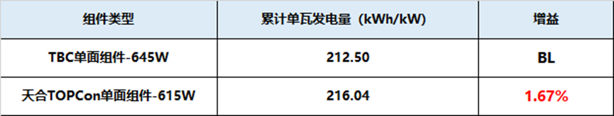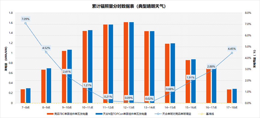 典型晴朗天气,在太阳辐照较低的晨昏时段,TOPCon组件发电也明显更优。早晨7点至8点,至尊N型i-TOPCon组件较TBC组件单瓦发电量增益可达7.09%,全天平均发电增益达1.41%。