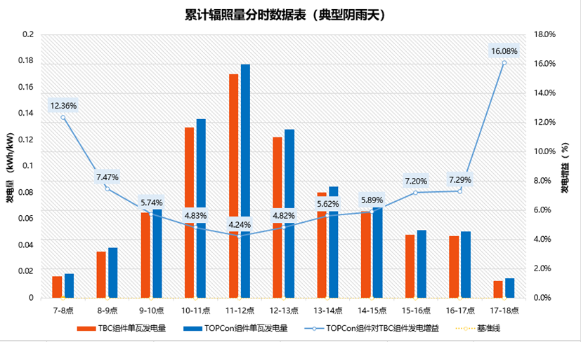 在实证期间,海口市连续多天出现过多云和阴雨天气。至尊N型i-TOPCon组件凭借出色的弱光响应能力,全天的平均发电增益达到5.7%。尤其在早晨7点到8点,TOPCon组件相较TBC组件的发电量增益达到了12.36%,黄昏时段的发电量增益则达到了16.08%。由此可以看出,辐照度越低,TOPCon组件的单瓦发电能力的优势越大。