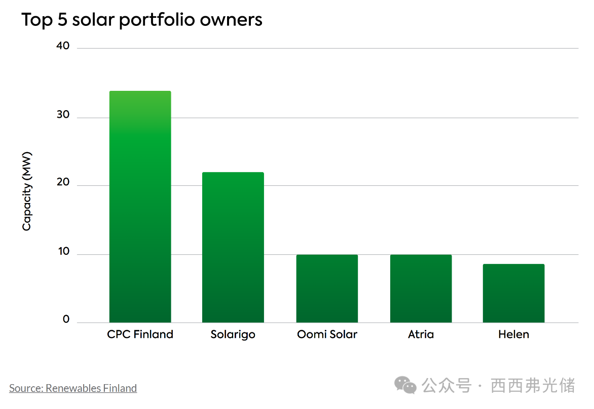 截至2024年底,芬兰排名前五的太阳能资产所有者合计占全国公用事业规模太阳能装机容量的约67%。其中,CPC Finland公司运营着全国最大的太阳能电站——位于Rauma的32 MW Lakari项目。