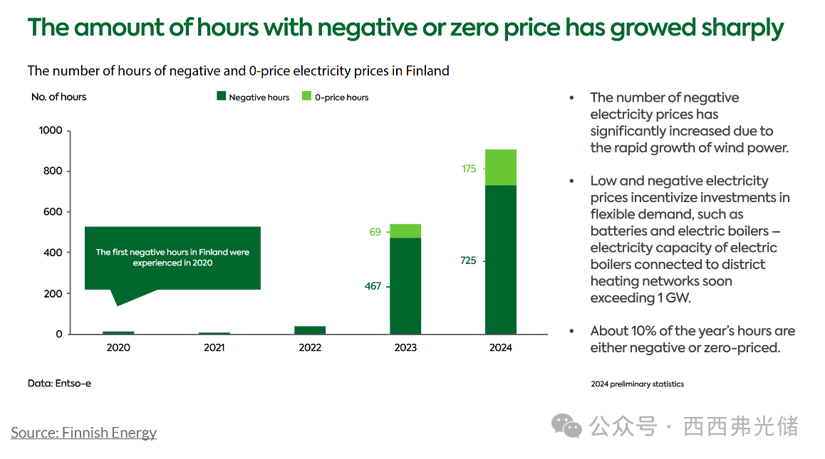 市场驱动力BESS市场增长的一个主要驱动因素是零电价和负电价小时数的激增。芬兰能源协会的数据显示,2024年零电价或负电价的小时数达到了900小时,远高于2023年的536小时。这种价格波动激励了对电池和电锅炉等灵活性资产的投资。