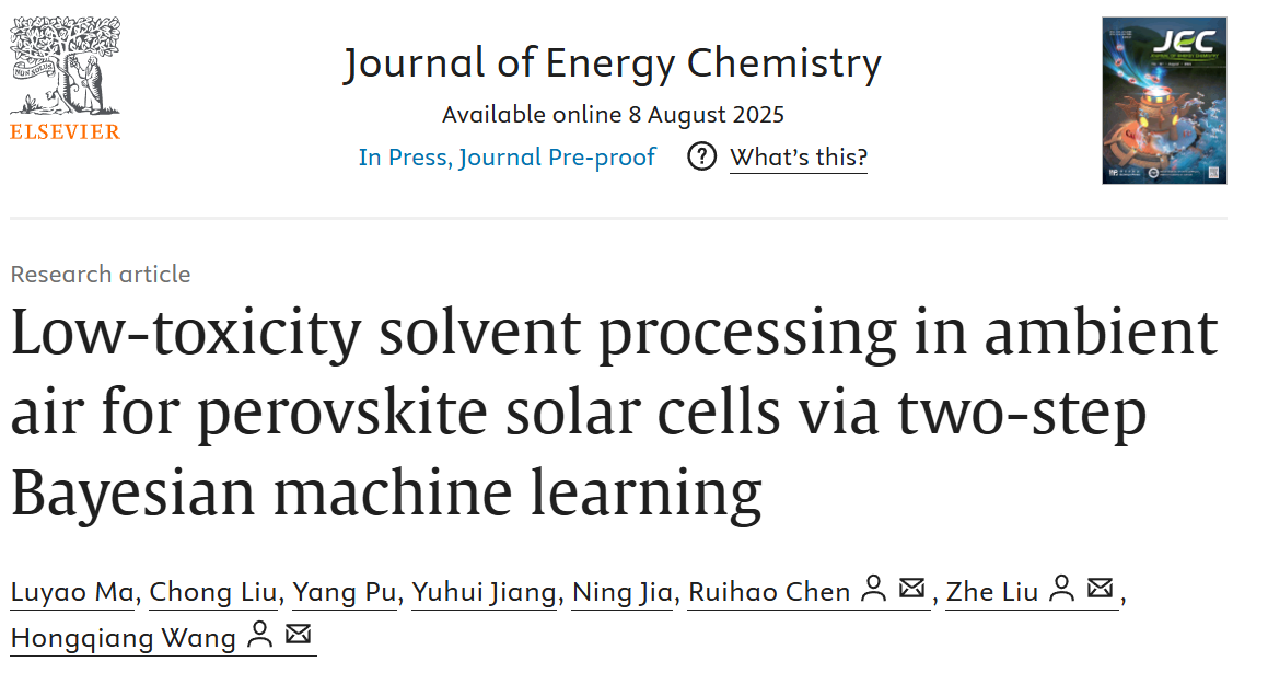 Luyao Ma, Chong Liu, Yang Pu, Yuhui Jiang, Ning Jia, Ruihao Chen, Zhe Liu, Hongqiang Wang,Low-toxicity solvent processing in ambient air for perovskite solar cells via two-step Bayesian machine learning,Journal of Energy Chemistry,2025,ISSN 2095-4956,