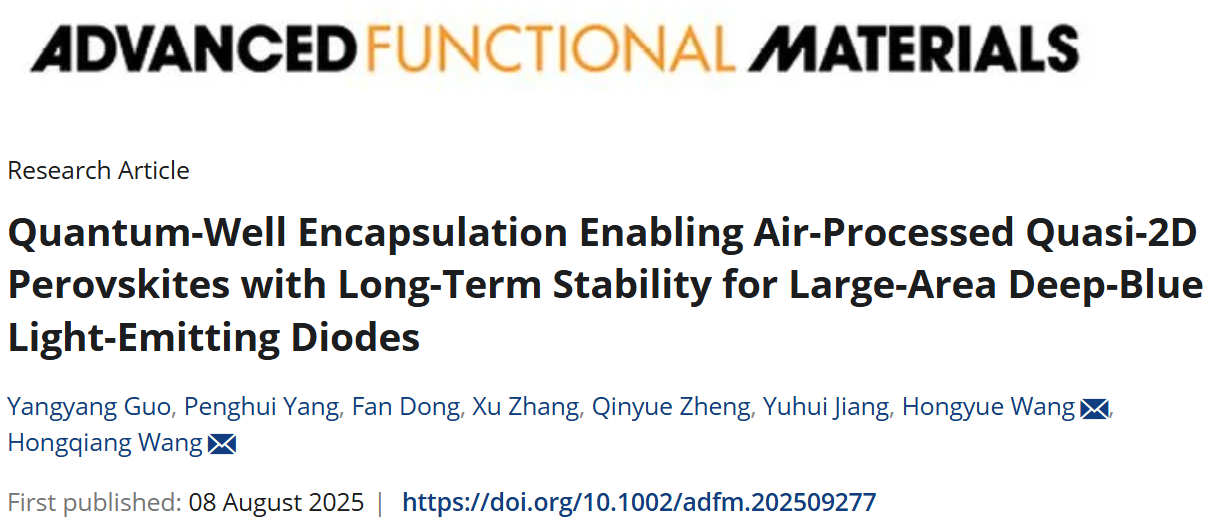 Y. Guo, P. Yang, F. Dong, et al. “ Quantum-Well Encapsulation Enabling Air-Processed Quasi-2D Perovskites with Long-Term Stability for Large-Area Deep-Blue Light-Emitting Diodes.” Adv. Funct. Mater. (2025): e09277.