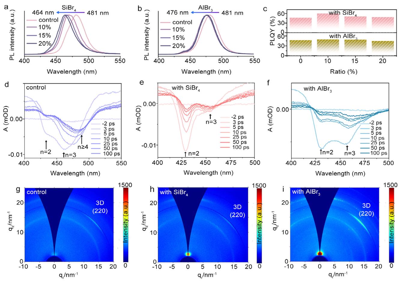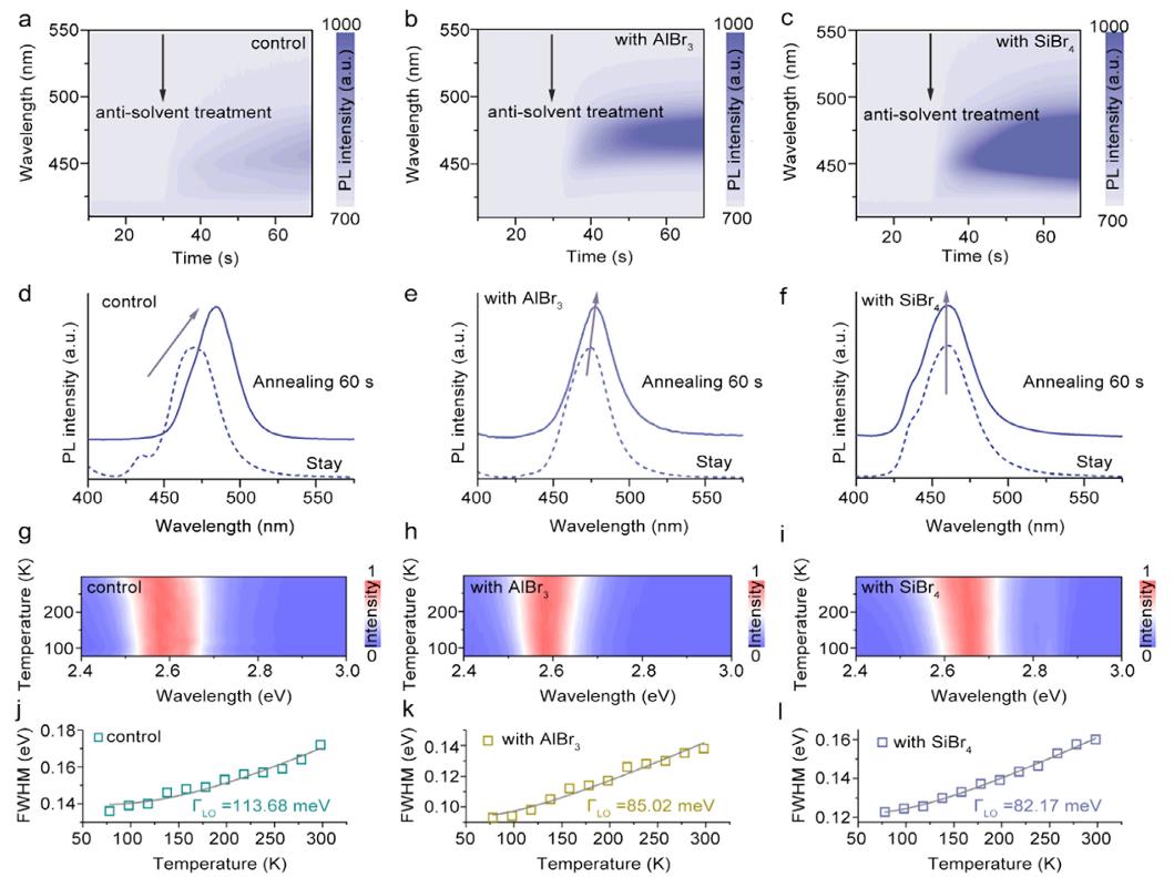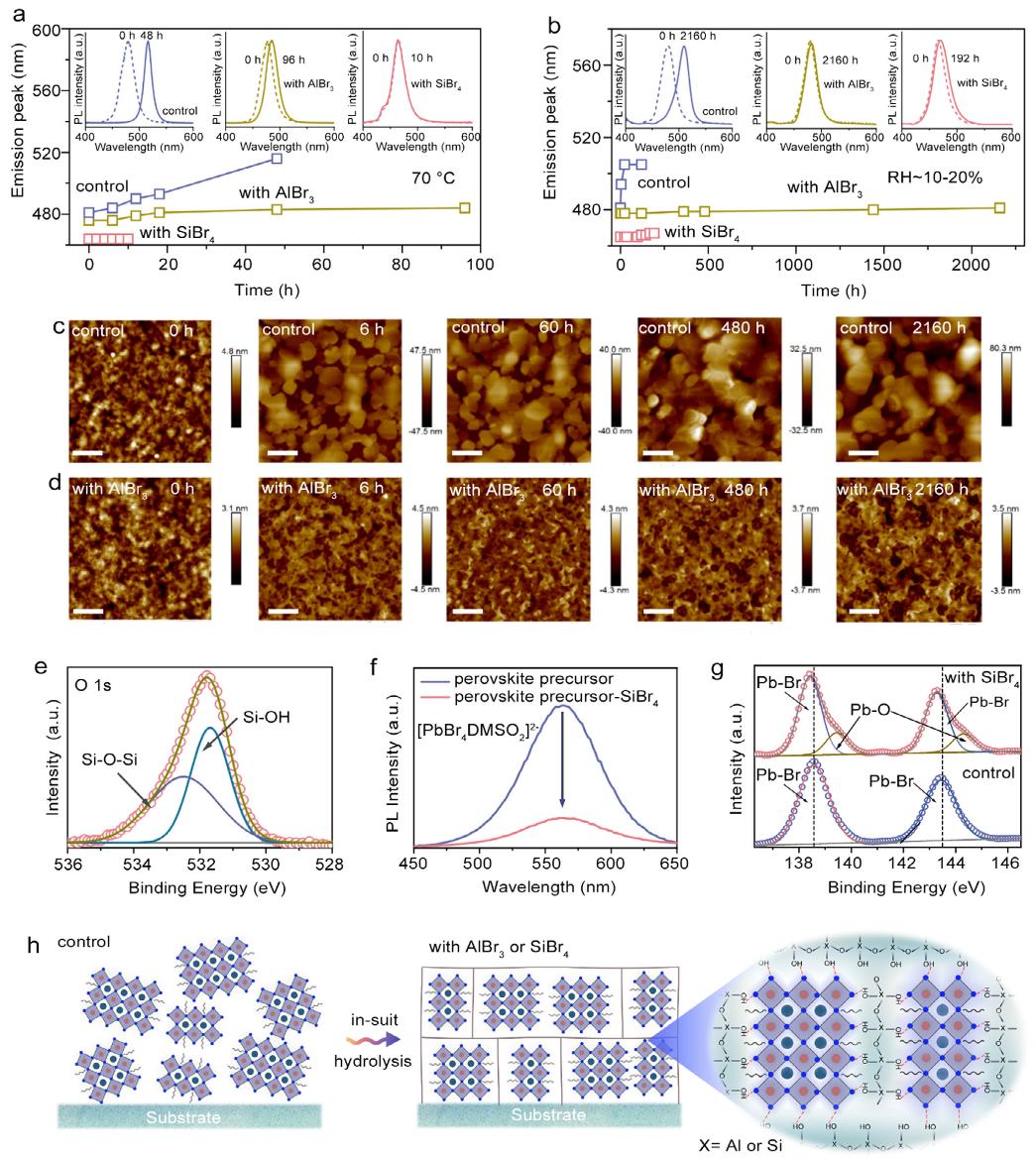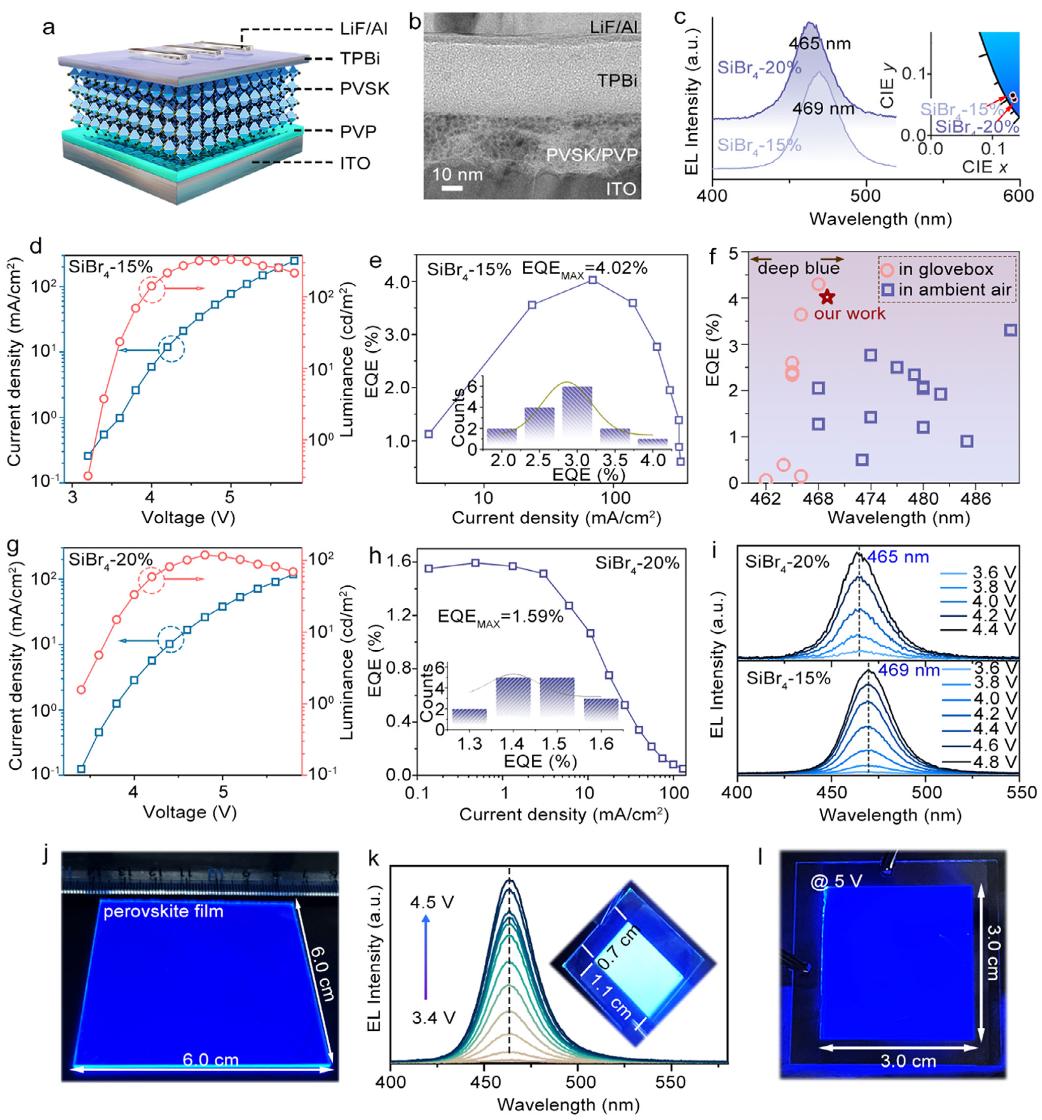 纯溴准二维钙钛矿在空气制备的钙钛矿发光二极管(PeLEDs)中取得了显著进展,但其超薄量子阱的高表面活性导致深蓝光发射薄膜在环境条件下仍面临长期稳定性和光学可调性的挑战。本文西北工业大学王红月和王洪强等人提出了一种水解策略,通过AlBr₃或SiBr₄水解生成氧桥网络,实现对量子阱表面的钝化封装。空气制备的蓝色薄膜表现出高达50.9%的光致发光量子产率(PLQY),并在空气(相对湿度10-20%,室温)中暴露2160小时或70°C热刺激下92小时后仍保持稳定的深蓝光发射,其长期稳定性甚至优于惰性环境中制备的同类薄膜。深蓝光PeLEDs的外量子效率(EQE)达到4.02%,创下空气制备蓝光器件的记录,且性能与手套箱中制备的器件相当。此外,研究还展示了发射面积为9.0 cm²的大面积深蓝光PeLEDs,为高性能钙钛矿显示技术的商业化提供了可行路径。