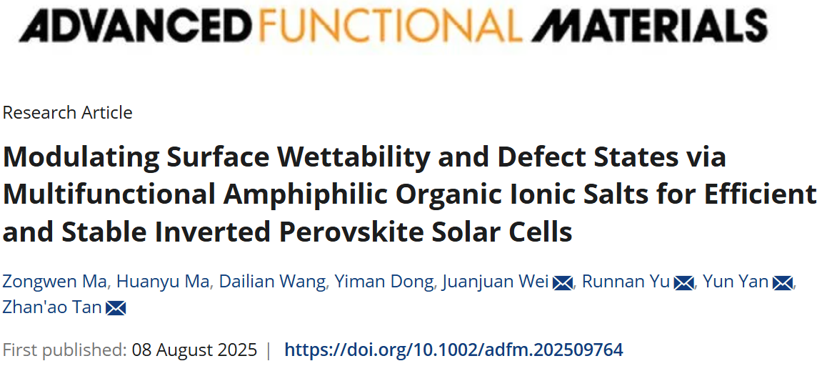 Z. Ma, H. Ma, D. Wang, et al. “ Modulating Surface Wettability and Defect States via Multifunctional Amphiphilic Organic Ionic Salts for Efficient and Stable Inverted Perovskite Solar Cells.”Adv. Funct. Mater.(2025): e09764.
