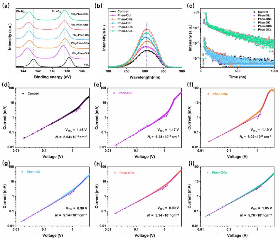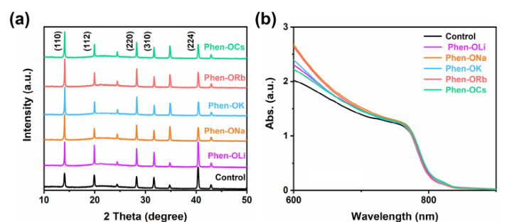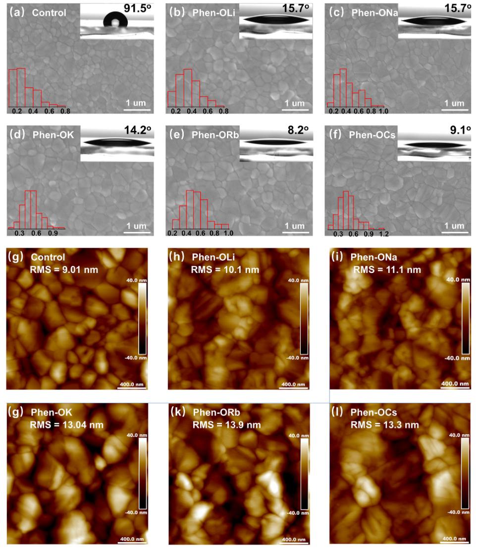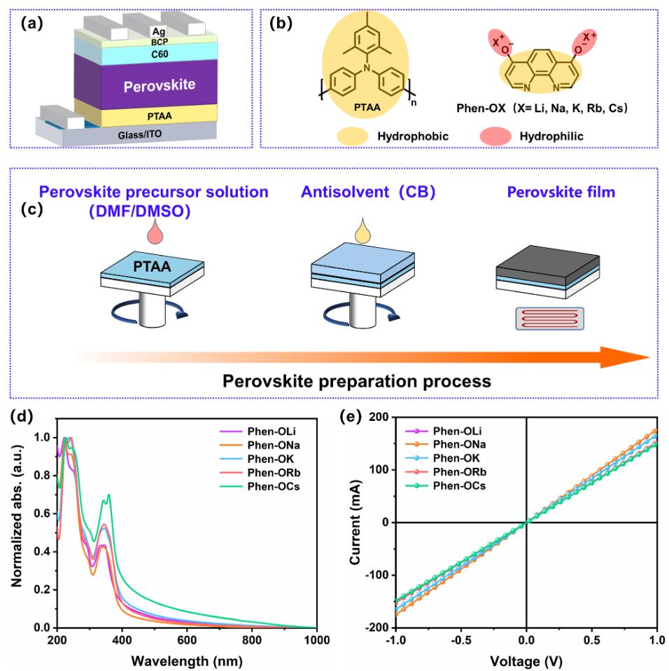 多功能两亲性设计:Phen-OX兼具疏水菲咯啉骨架和亲水碱金属离子基团,可同步改善PTAA表面润湿性并钝化钙钛矿缺陷。