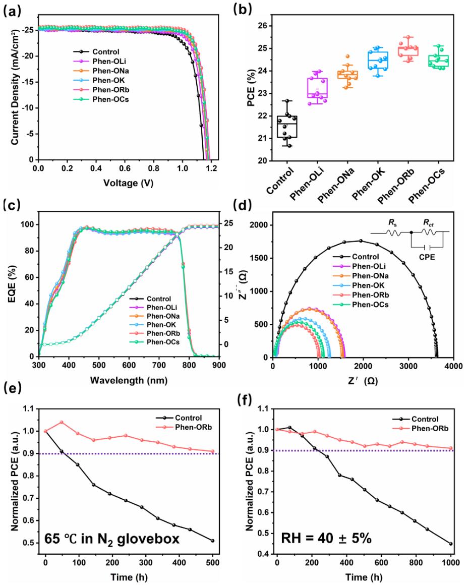 稳定性突破:Phen-OX修饰后器件在65°C氮气环境中500小时保持91%初始效率,湿度环境下(40±5% RH)1000小时性能衰减仅9%。