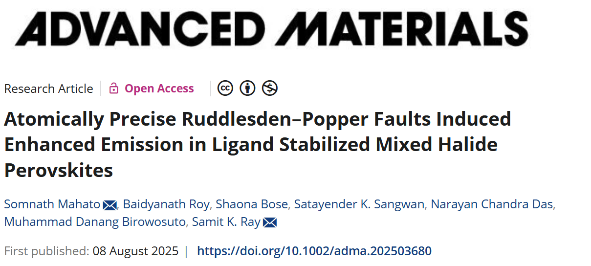 S. Mahato, B. Roy, S. Bose, et al. “ Atomically Precise Ruddlesden–Popper Faults Induced Enhanced Emission in Ligand Stabilized Mixed Halide Perovskites.” Adv. Mater. (2025): e03680.