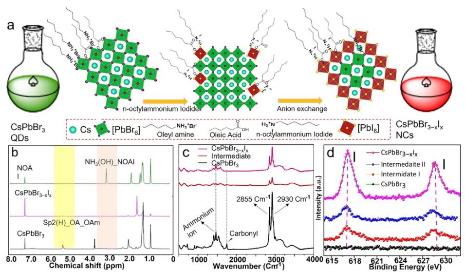 高效发光设计:NOAl配体诱导卤素交换,使电致发光红移127 nm(至623 nm),强度提升79%,并延长激子寿命至45.23 ns。