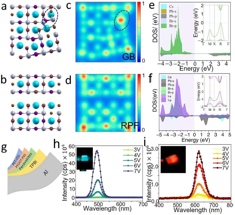 通过引入正辛基碘化铵(NOAl)配体,成功将CsPbBr₃量子点(QDs)转化为CsPbBr₃₋ₓIₓ纳米晶,实现电致发光(EL)从496 nm红移至623 nm,强度提升79%。RPFs和晶界(GBs)的应变分析表明,这些缺陷未引入深能级陷阱,反而通过局域载流子增强了辐射复合。