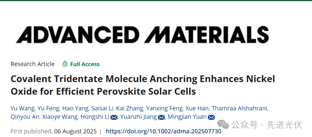 Wang, Y., Feng, Y., Yang, H. et al. Covalent Tridentate Molecule Anchoring Enhances Nickel Oxide for Efficient Perovskite Solar Cells. Advanced Materials (2025).