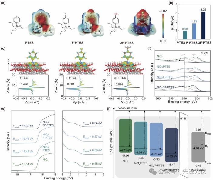 三齿共价锚定:3F-PTES分子通过三齿Si-O-Ni共价键与NiOₓ结合,结合能达-12.28 eV,是传统羧酸锚定(-3.91 eV)的3.14倍。