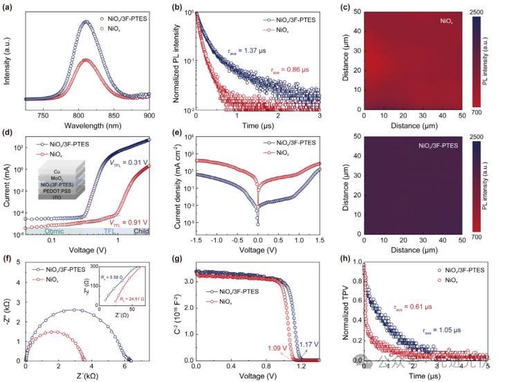 图3通过多种光谱技术揭示了3F-PTES对界面缺陷和载流子动力学的改善。稳态PL光谱显示修饰后钙钛矿荧光强度提升2倍,TRPL寿命从0.86 μs延长至1.37 μs,PL