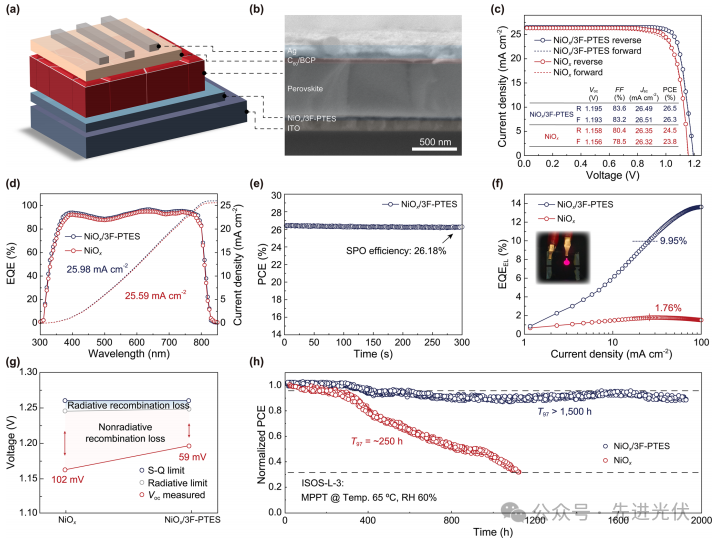 图4展示了基于3F-PTES修饰的完整器件性能。截面SEM清晰显示ITO/NiOx/钙钛矿/C₆₀/BCP/Ag的层级结构,冠军器件J-V曲线实现Voc=1.195 V、FF=83.6%、PCE=26.47%,EQE积分电流达25.98 mA/cm²。电致发光量子效率(EQEEL)从1.76%跃升至9.95%,Voc损失分析表明非辐射复合损失仅占4.9%。加速老化测试中,器件在65°C/60%RH条件下1500小时仍保持97%初始效率,远超未修饰器件的580小时寿命,凸显三齿共价锚定的长效稳定性优势。