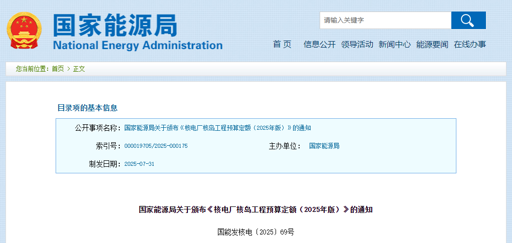国家能源局关于颁布《核电厂核岛工程预算定额(2025年版)》的通知