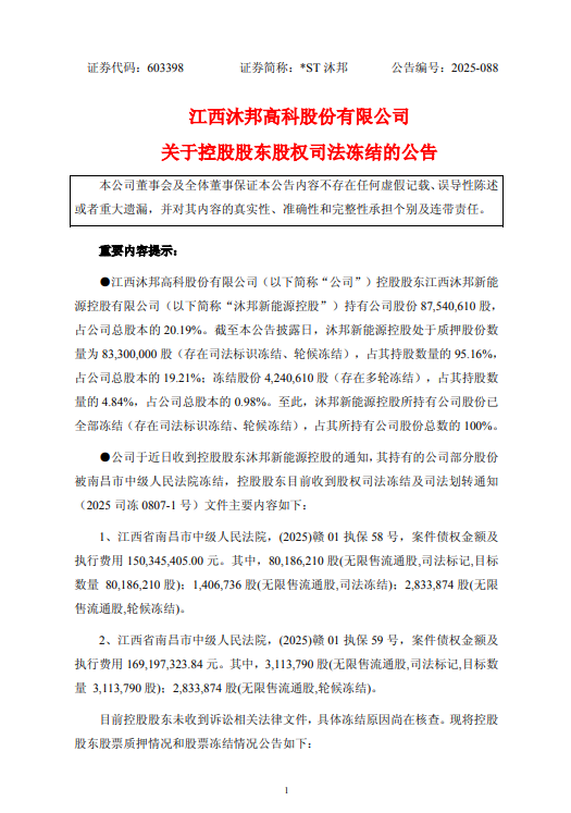 近日,*ST沐邦(603398)发布股权冻结公告,控股股东江西沐邦新能源控股有限公司(以下简称“沐邦新能源控股”)所持全部公司股份遭司法冻结及轮候冻结,涉及股份占公司总股本的20.19%。