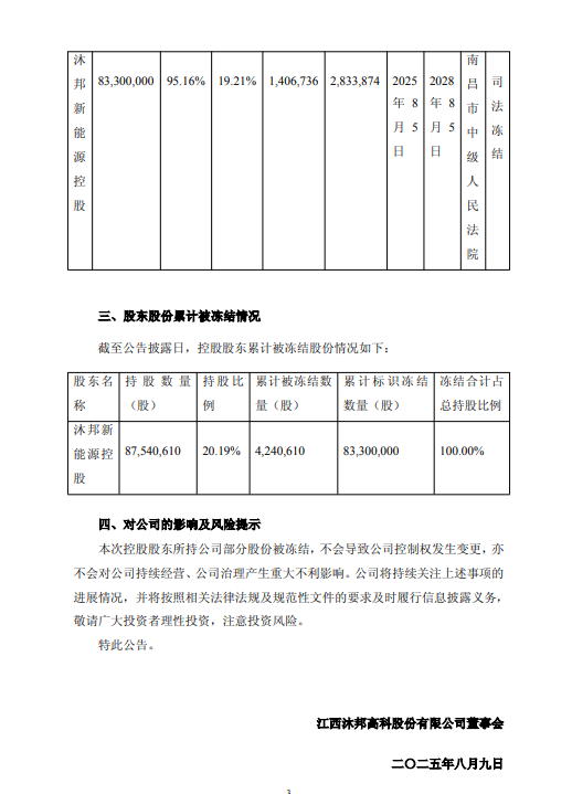 据公告披露,截至公告披露日,沐邦新能源控股持有ST沐邦股份87,540,610股,占公司总股本的20.19%。其中,83,300,000股(占其持股的95.16%、公司总股本的19.21%)处于质押状态,并附带司法标识冻结及轮候冻结;剩余4,240,610股(占其持股的4.84%、公司总股本的0.98%)亦被多轮司法冻结。至此,沐邦新能源控股所持ST沐邦股份已100%被冻结,公司控制权面临潜在风险。