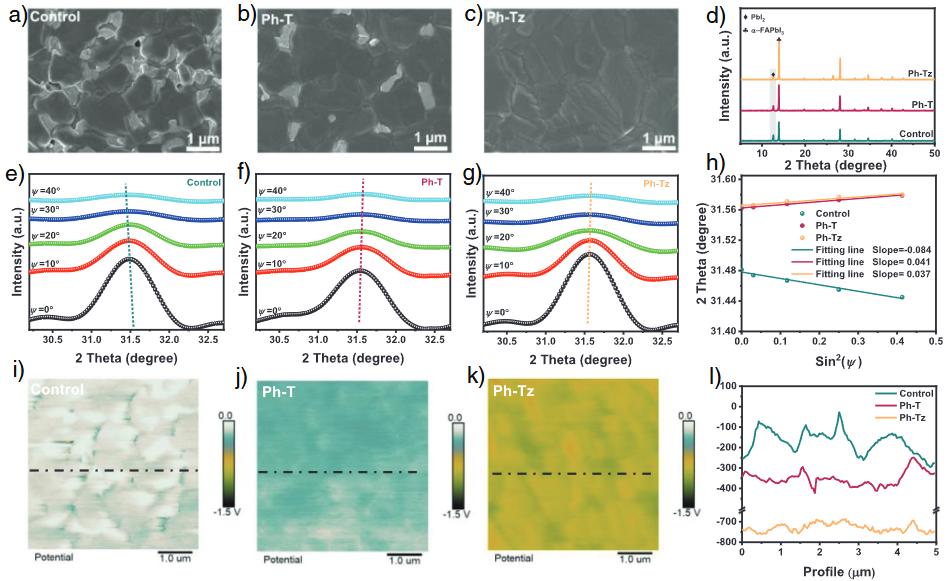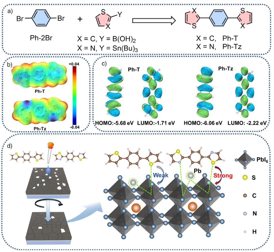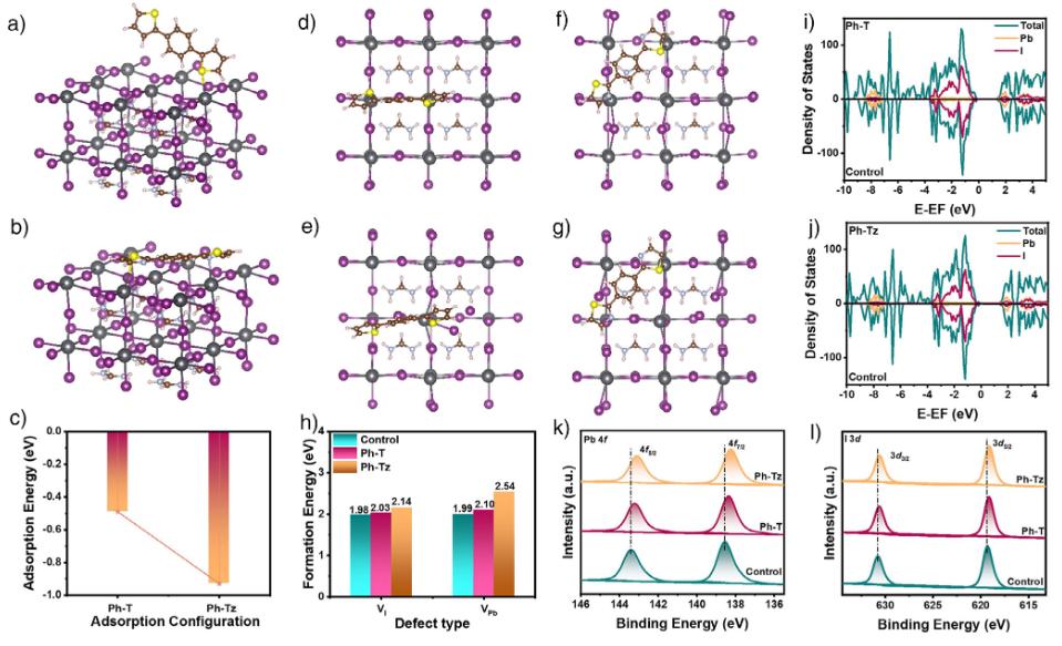 双位点协同钝化:Ph-Tz分子通过噻唑环的S和N原子与钙钛矿表面的Pb²⁺缺陷形成双重配位,显著降低深能级缺陷态,抑制非辐射复合,提升器件效率至25.85%。