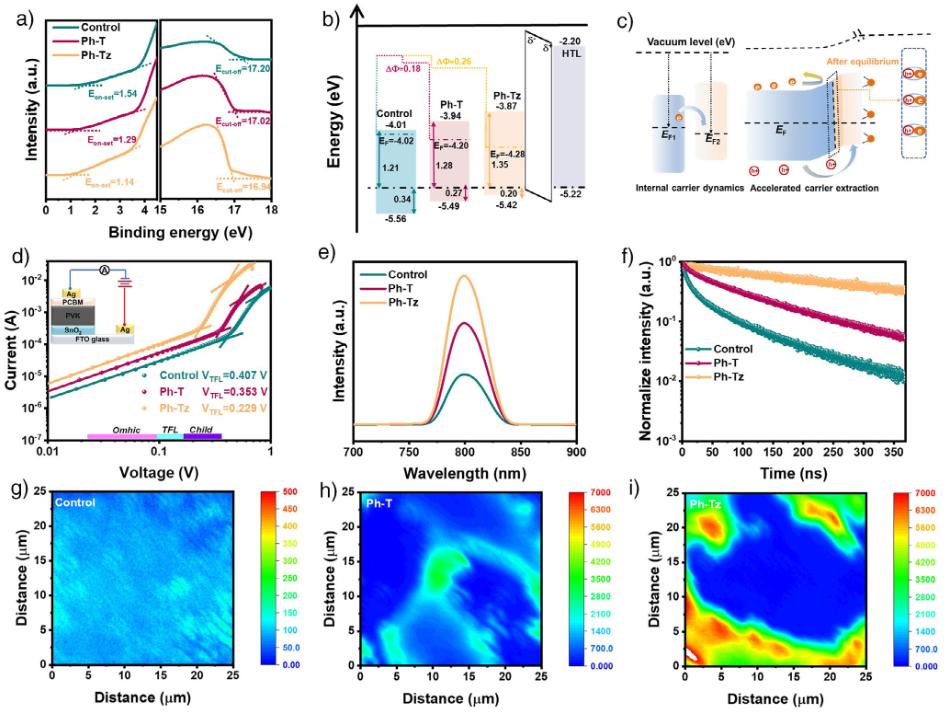 界面能级梯度优化:分子偶极层诱导表面功函数提升,形成向上能带弯曲,加速空穴提取,同时减少界面能量损失,开路电压(VOC)达1.178 V。
