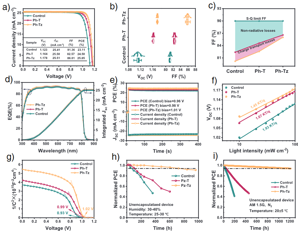长效稳定性突破:Ph-Tz钝化的器件在湿热环境(30–40% RH)下1000小时后保留90.7%初始效率,连续光照1200小时无显著衰减,为商业化应用提供可能。
