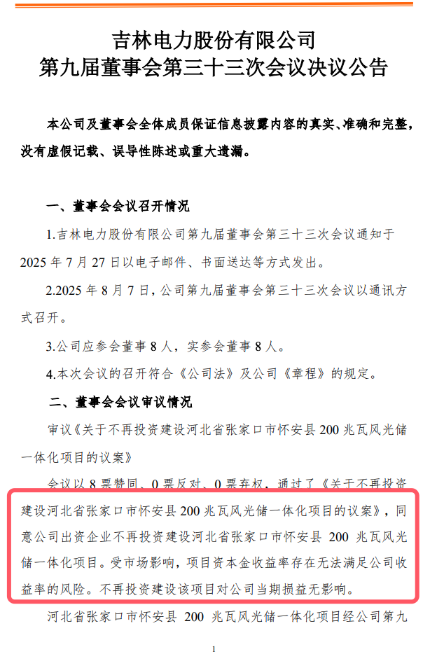 8月8日,国家电投旗下吉电股份公告宣布,董事会决议,不再投资建设河北省张家口市怀安县200MW风光储一体化项目。